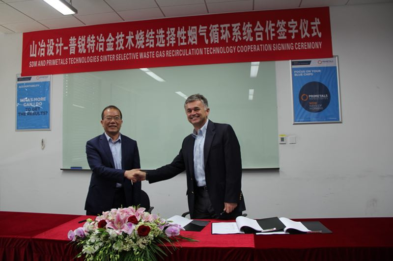 2018年5月24日,在普銳特冶金技術(中國)有限公司總部上海,公司董事長魏新民和普銳特冶金中國區CFO Stefan先生簽訂了燒結機選擇性煙氣循環(SWGR)技術合作協議,公司副總經理宋志順、設計管理部總師孫榮生、市場部部長趙圣存和普銳特冶金節能環保部總經理Peter、營銷總監梁君、山東大區經理孫磊一同參加了本次合作協議的簽約儀式。此協議的簽訂標志著公司開始與普銳特冶金在中國國內乃至印度、伊朗共同推廣燒結機煙氣循環技術。