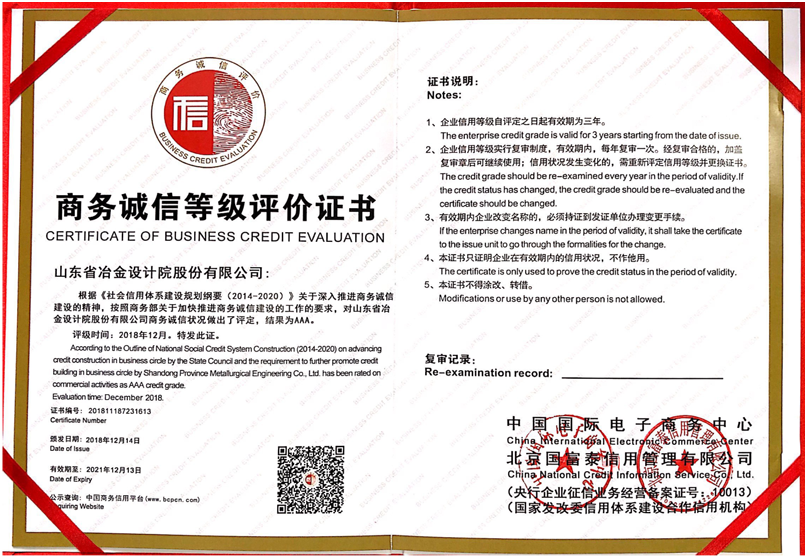 本次信用評級經過資料申報、行業調查、周邊訪問等一系列社會評估工作程序,經國家商務部中國國際電子商務中心、北京國富泰信用管理有限公司對公司的信用記錄、管理能力、經營水平、社會形象、財務狀況、顧客滿意度、發展前景等綜合實力進行嚴格、全面的分析和審核,最終公司獲得一致通過,并被評為商務誠信等級AAA級信用企業。這是對企業信用的最高等級評價,標志著公司強大的企業綜合實力和良好企業信用度獲得了高度認可。